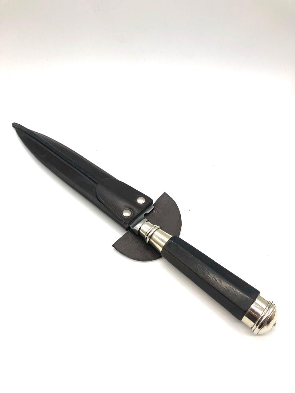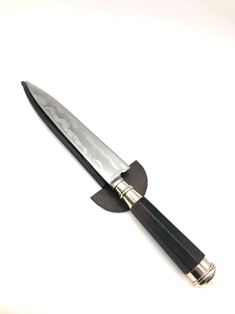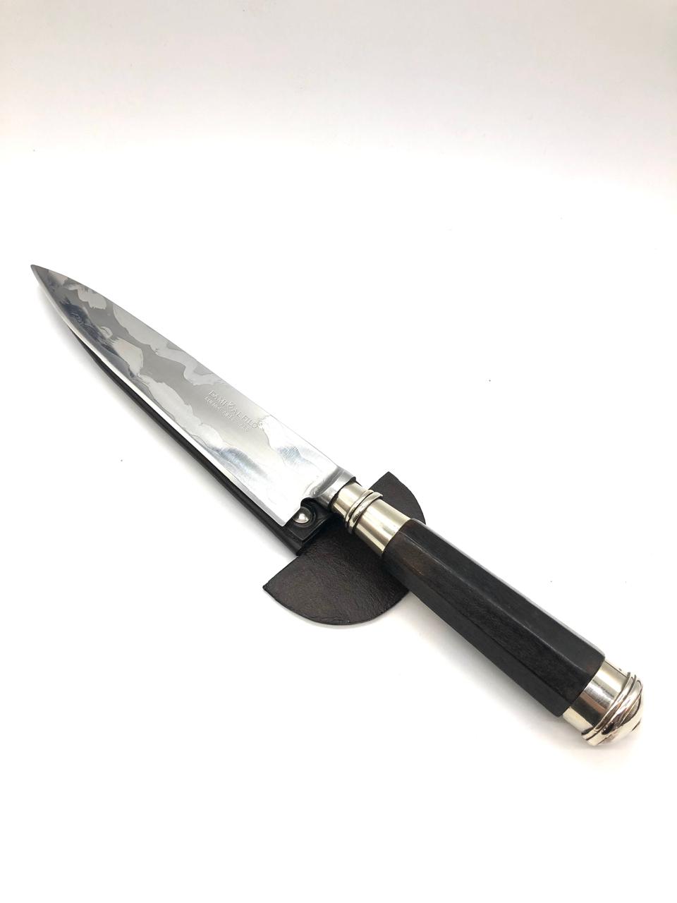 El cabo octogonal, realizado en madera de quebracho quemado, se complementa con una doble guarda de alpaca que aporta solidez y elegancia. La vaina, confeccionada en cuero vaqueta color marrón habano, acompaña la pieza con sobriedad y distinción, cuidando cada detalle.