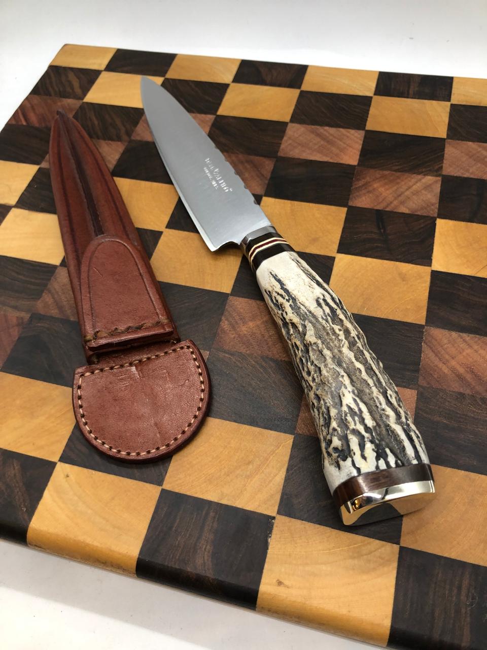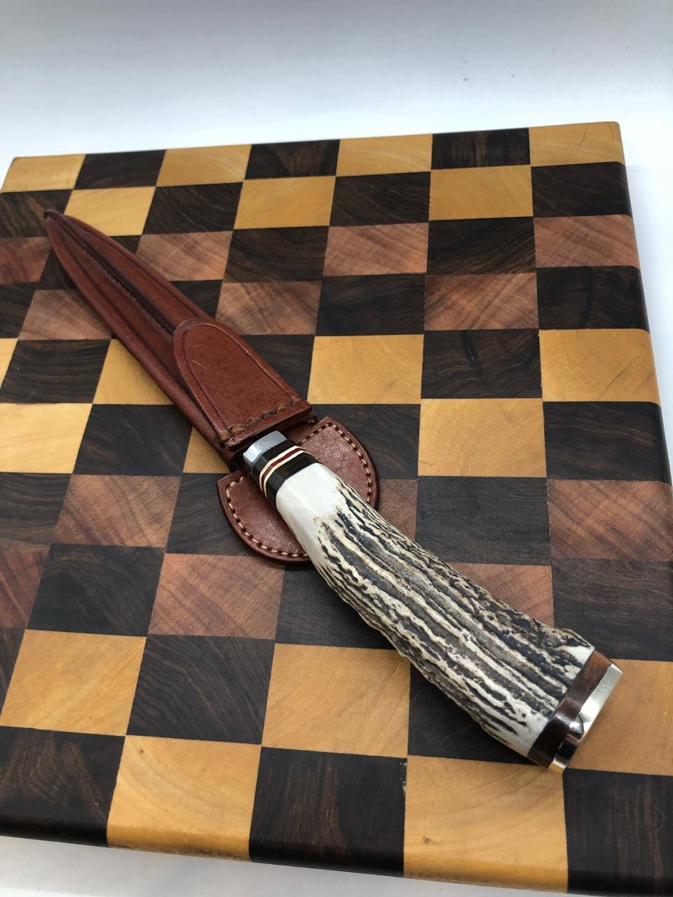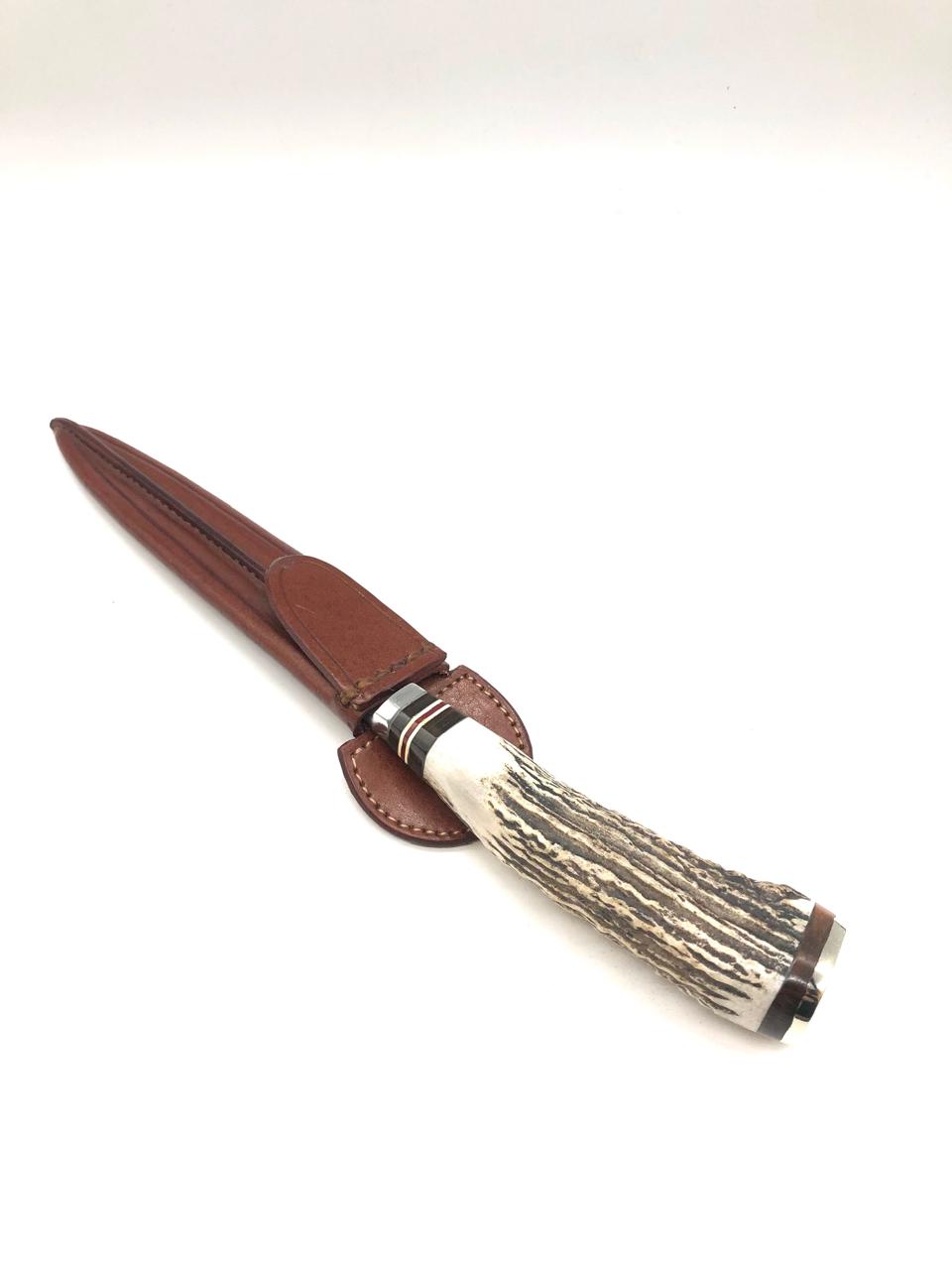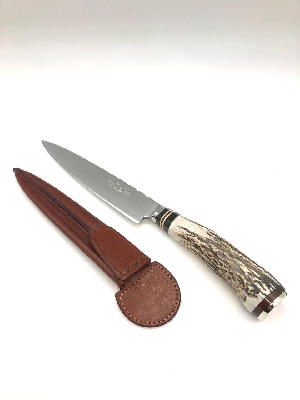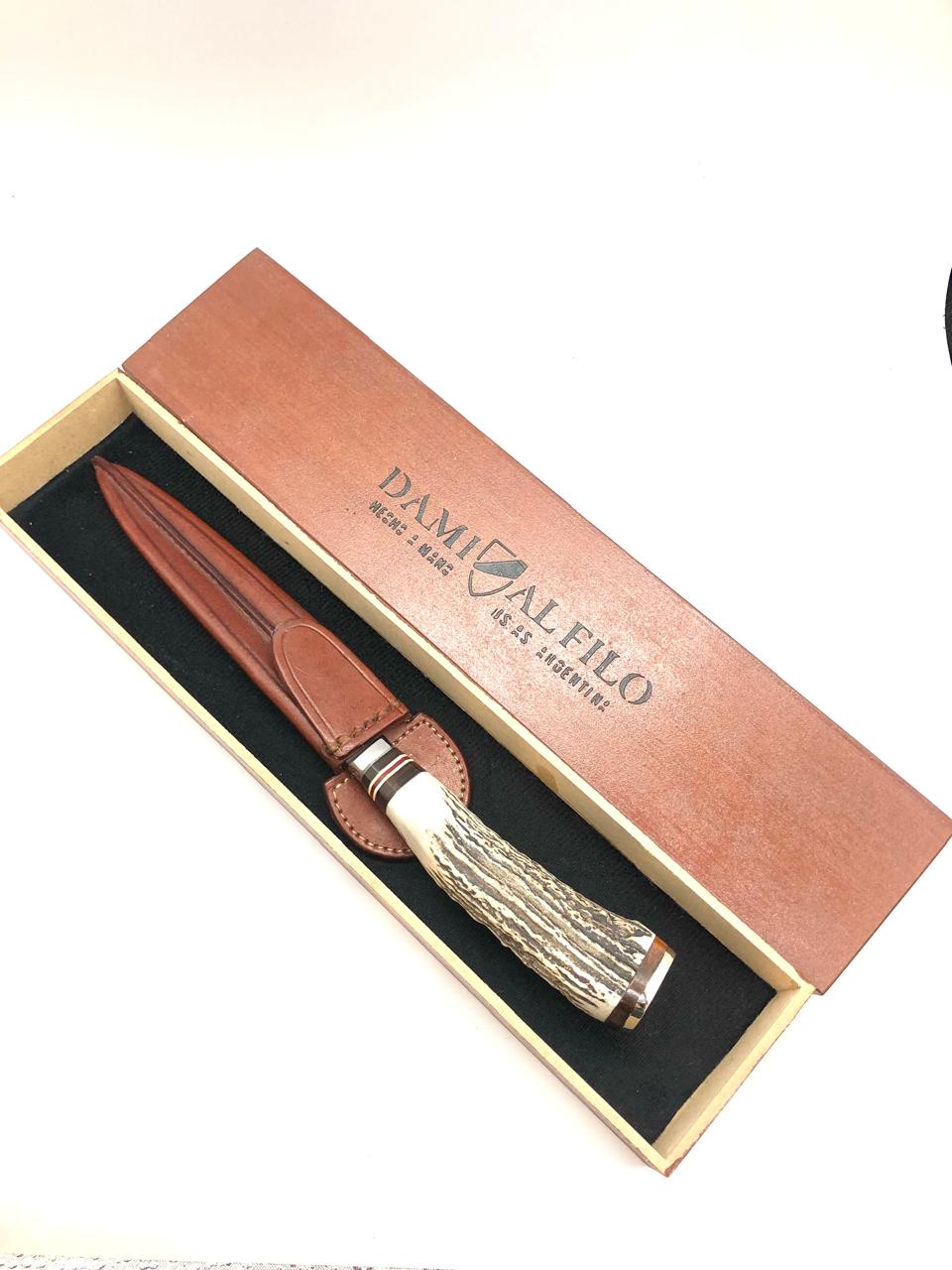 El cabo combina ciervo axis con separadores de Kevlar, micarta y madera de quebracho, logrando una estética única y una textura firme en la mano. La terminación en alpaca de 4 mm aporta solidez y elegancia. La vaina, confeccionada en cuero London color suela, acompaña la pieza con distinción y protección.
